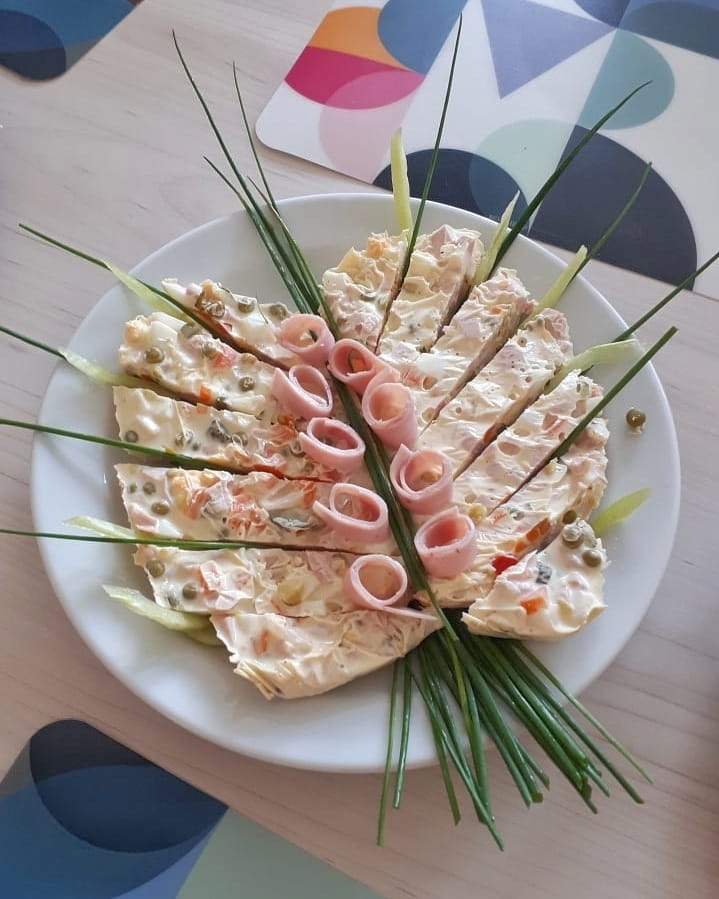 Перемешиваем всё нарезанное, добавляем майонез, получается похоже на салат.