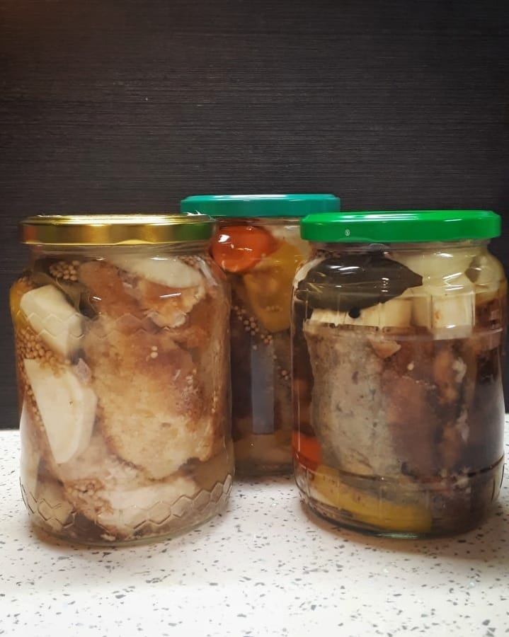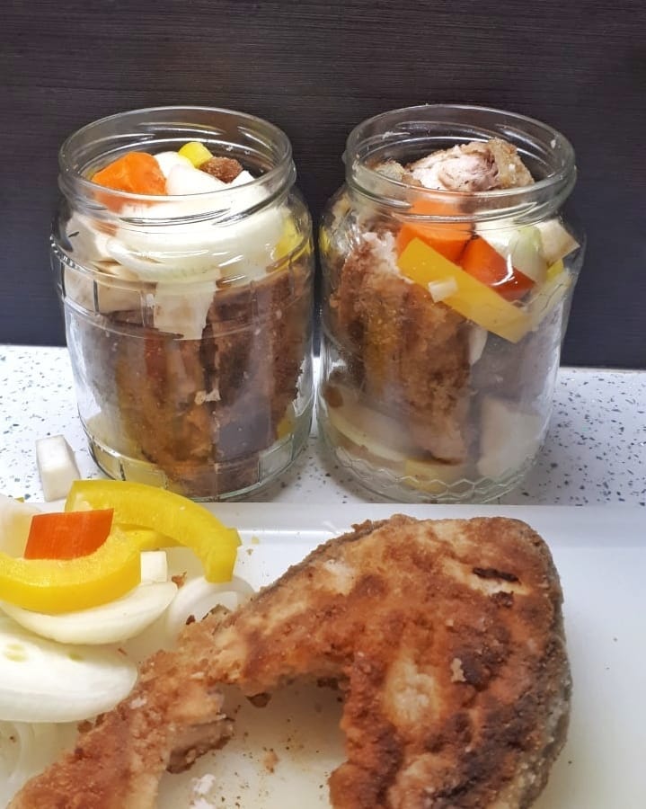 Жареные куски рыбы укладываем в стеклянные банки для консервирования, перекладывая кусками морковки, лука, корня сельдерея, петрушки, сладкого перца, всё что нравится, заливаем маринадом, закрываем, даём остыть и убираем в холодное место.