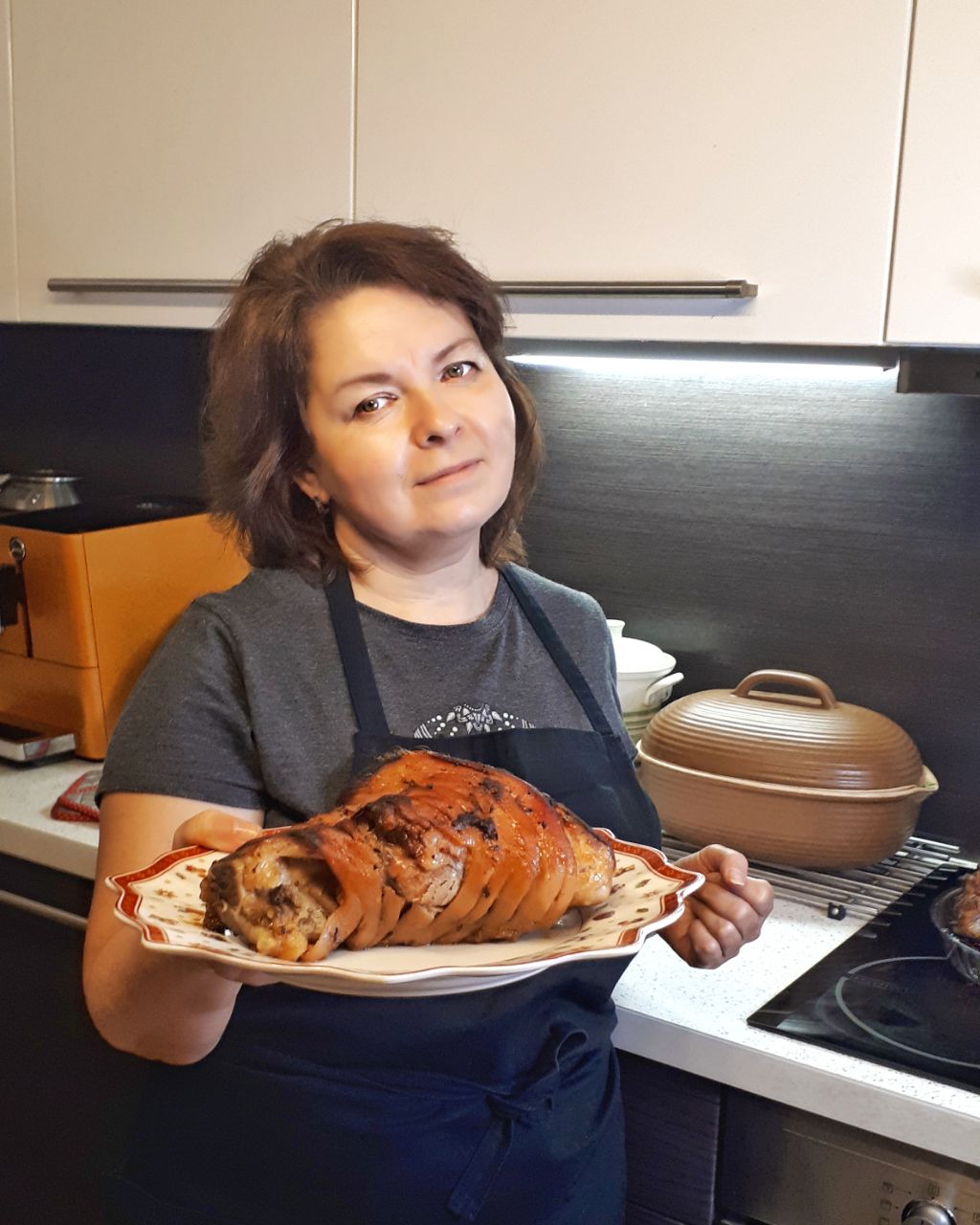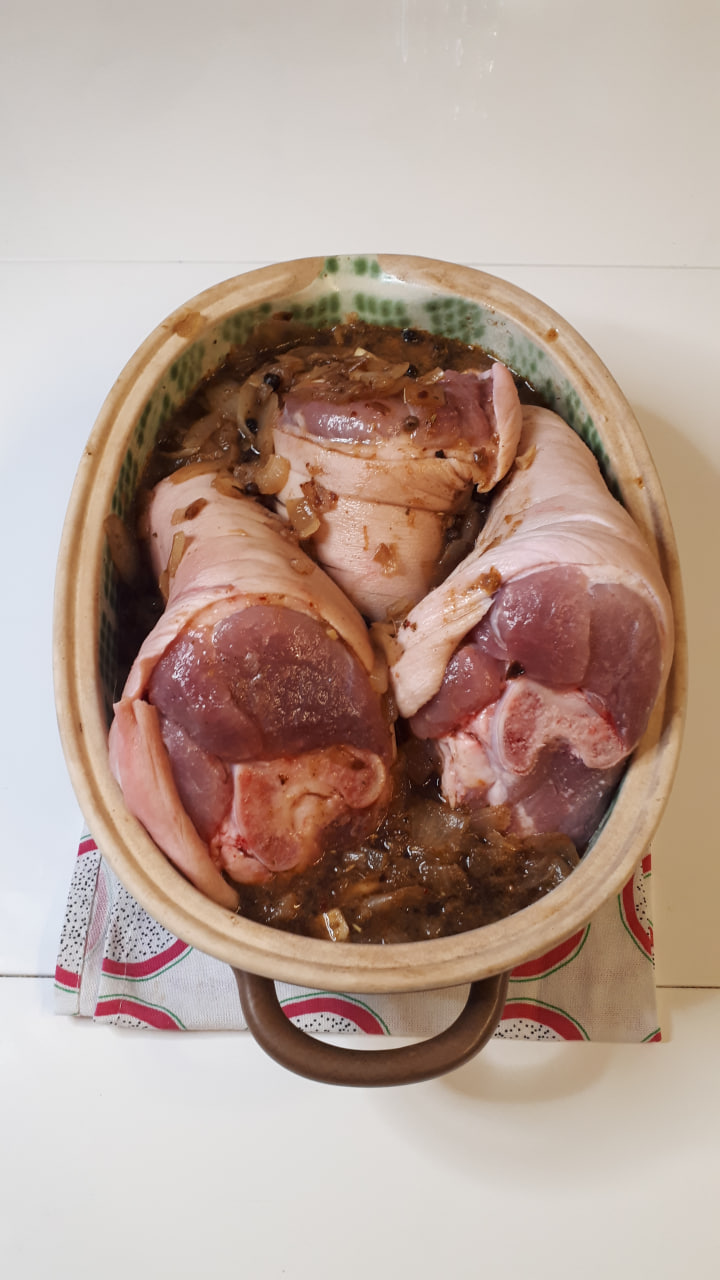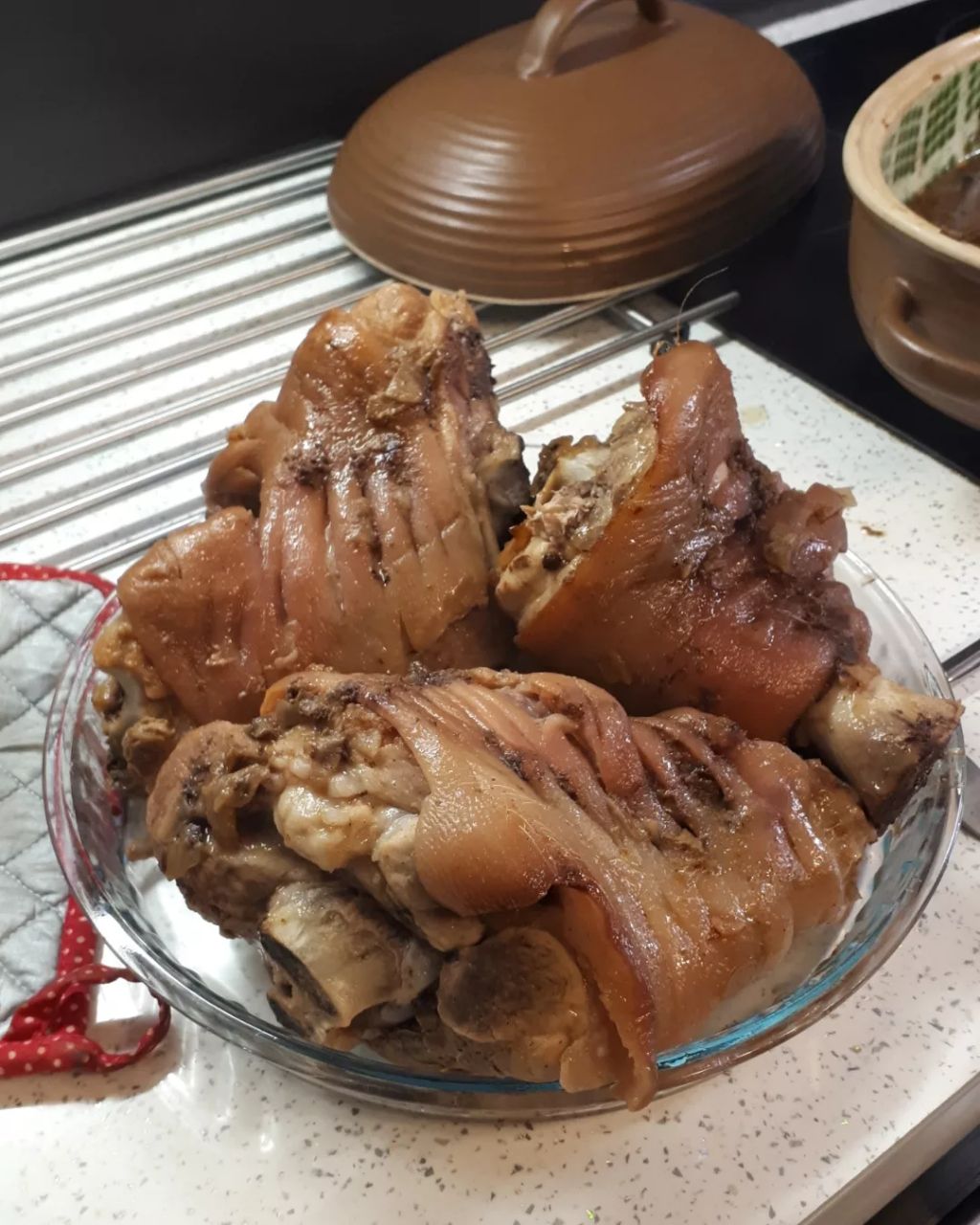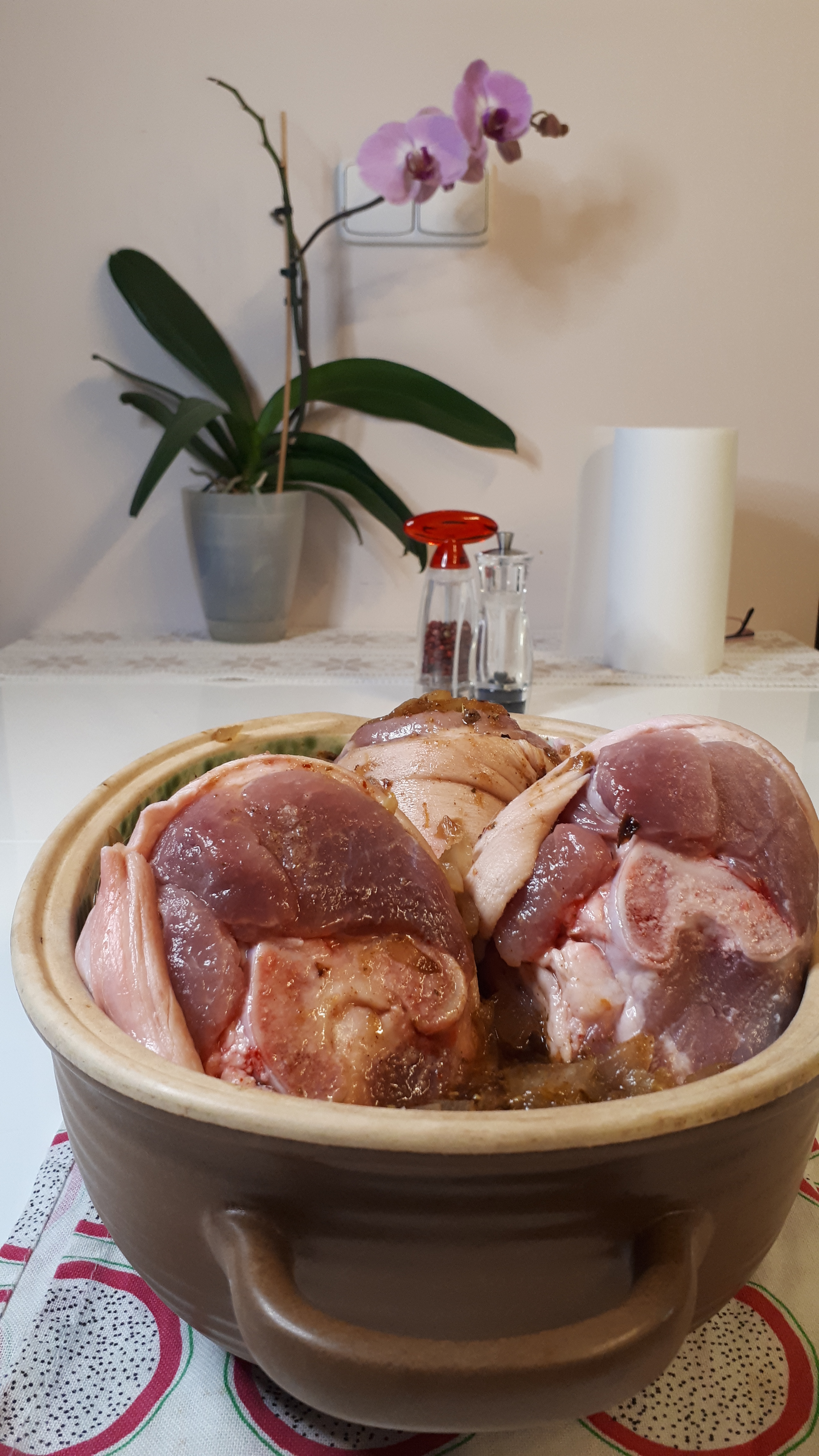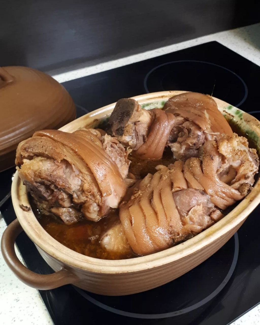 - Подготовьте форму с крышкой (лучше чугунную или керамическую) и положите в нее свиное колено. Теперь залейте его маринадом и запекайте в течение 6 часов (говорят, можно и на ночь оставить).