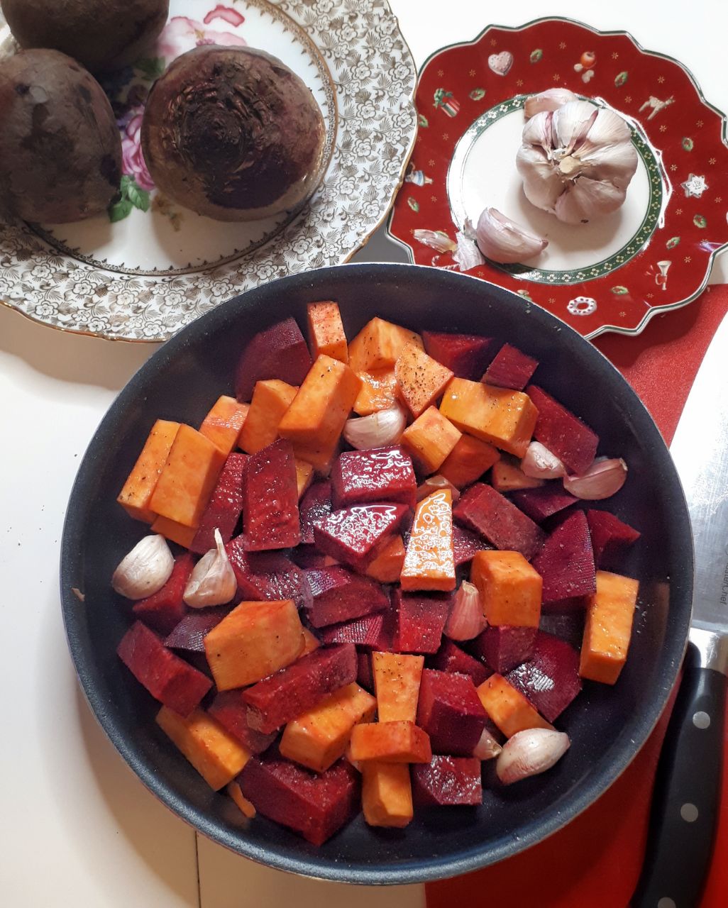 Любые корнеплоды и подходящие овощи, нарезаем кусочками, чтоб было «на один укус». Это могут быть: свёкла, репа, батат, морковь, тыква и т.д. Если чеснок, то в шкурке, иначе высохнет и будет невкусный. Смазываем их поверхность оливковым или другим растительным маслом, солим, перчим, можно посыпать розмарином или тимьяном. Запекаем минут 30-40.